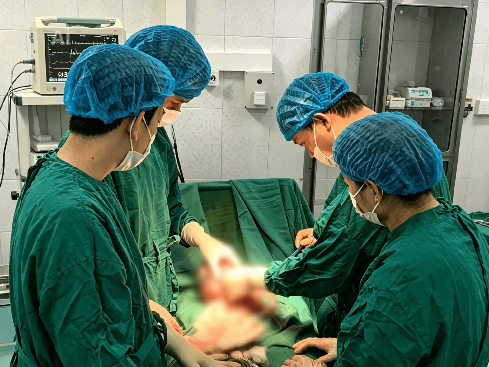 Trước tình trạng trên, ê-kíp phẫu thuật đã hội chẩn liên chuyên khoa kỹ lưỡng và đưa ra phương pháp can thiệp phù hợp. Ca mổ được tiến hành với sự phối hợp của nhiều chuyên khoa: chuyên khoa Sản (chủ trì), Gây mê hồi sức, Chẩn đoán hình ảnh, Ngoại Tổng hợp với kỹ thuật cao và sự chính xác tuyệt đối nhằm hạn chế tối đa các tai biến, biến chứng.
