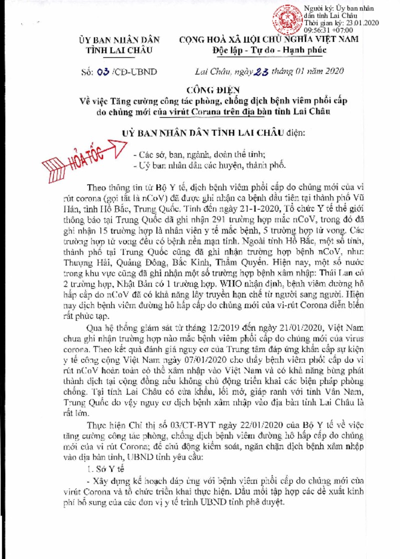 | Mô tả | Về việc tăng cường công tác phòng, chống dịch bệnh viêm phổi cấp do chủng mới của virus Corona trên địa bàn tỉnh Lai Châu |