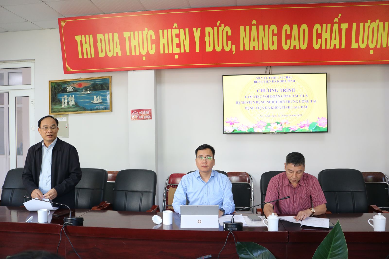 Sáng ngày 22/10/2025 Bệnh viện Đa khoa tỉnh Lai Châu làm việc với đoàn công tác của Bệnh viện nhiệt đới trung ương do TS Nguyễn Tuấn Khanh - Phó Viện Trưởng Viện Đào tạo và Nghiên cứu Bệnh nhiệt đới làm trưởng đoàn, Ths.Bs Nguyễn Thanh Thủy - Phó giám đốc Bệnh viện Đa khoa tỉnh và đại diện lãnh đạo các khoa, phòng với nội dung khảo sát đánh giá năng lực chuyên ngành Truyền nhiễm về nhân lực, cơ sở vật chất và trang thiết bị tại Bệnh viện đa khoa tỉnh Lai Châu