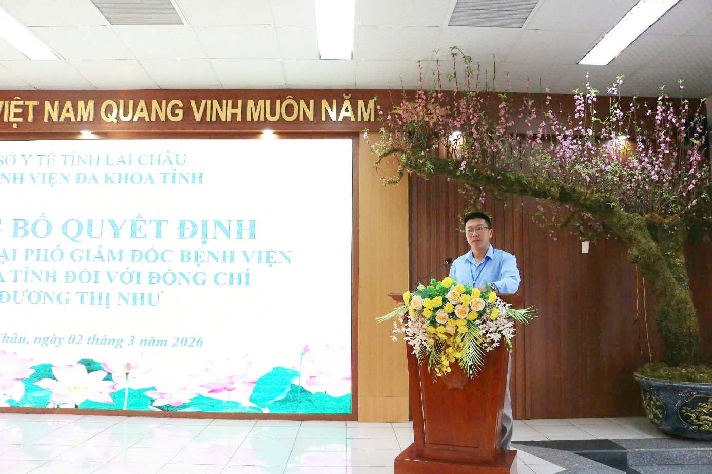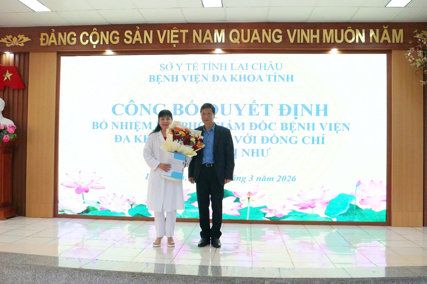 Tại buổi lễ, Trưởng Phòng Tổ chức Cán bộ đã công bố quyết định bổ nhiệm lại Phó Giám đốc Bệnh viện Đa khoa tỉnh: Bà Dương Thị Như, Bổ nhiệm theo QĐ 259/QĐ-UBND ngày 10/02/2026 giữ chức vụ Phó Giám đốc bệnh viện Đa khoa tỉnh trực thuộc sở Y tế tỉnh Lai Châu, thời gian bổ nhiệm 5 năm.